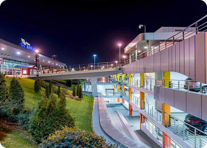 Для гостей аэропорта круглосуточно (24/7) доступна комфортабельная многоуровневая парковка, расположенная непосредственно перед терминалом.